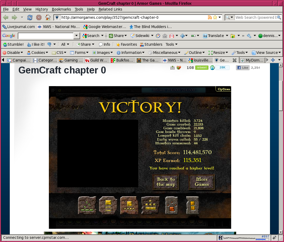 The final score/victory page. Gems created: 22153. Longest kill